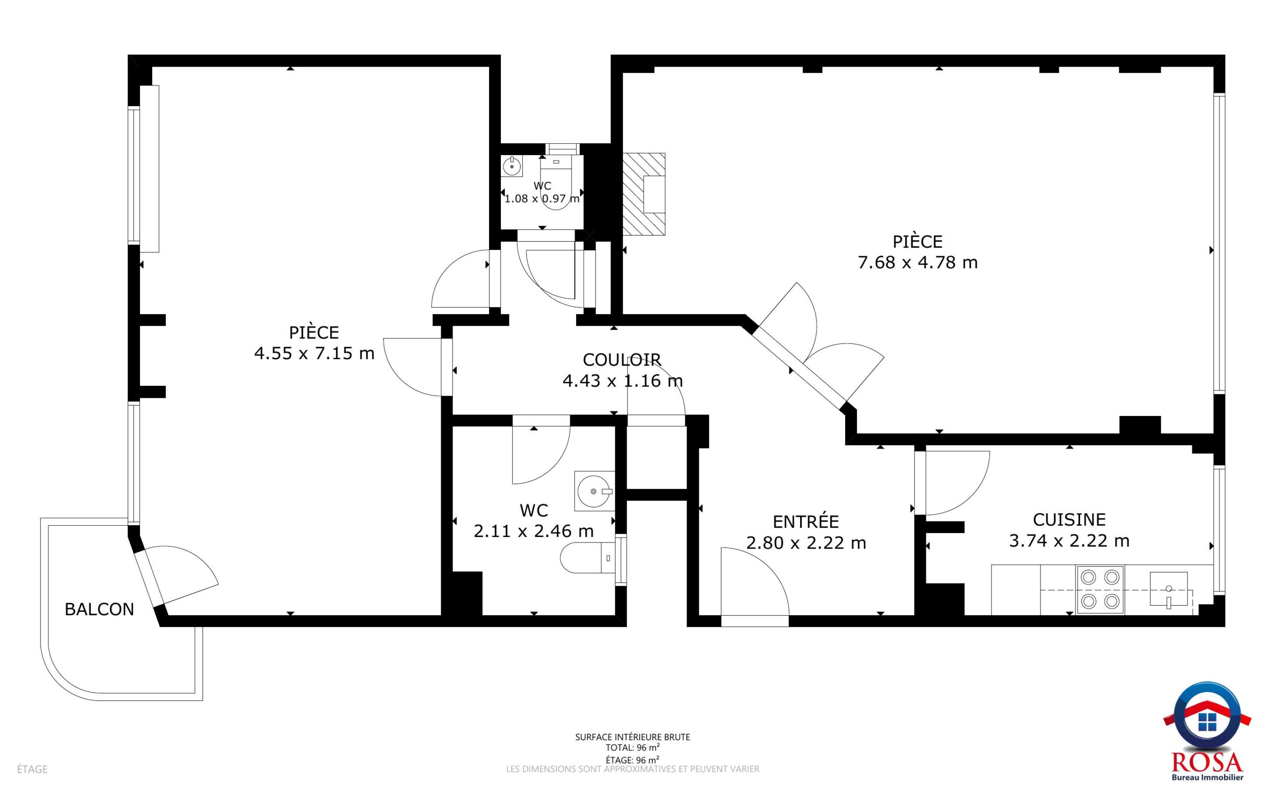 Hall d’entrée, spacieux living, cuisine équipée, salle de bain, WC séparé et grande chambre (possibilité de recréer facilement une seconde chambre).