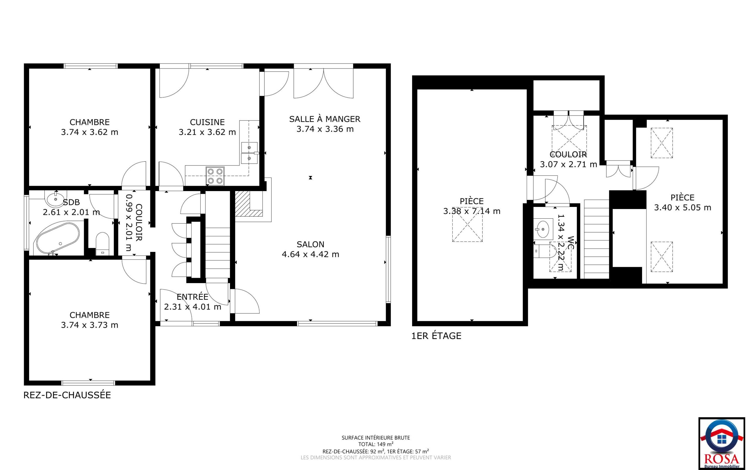 Au rez-de-chaussée, un hall d’entrée, un séjour lumineux, une cuisine semi équipée, un wc, une salle de bain et 2 chambres.