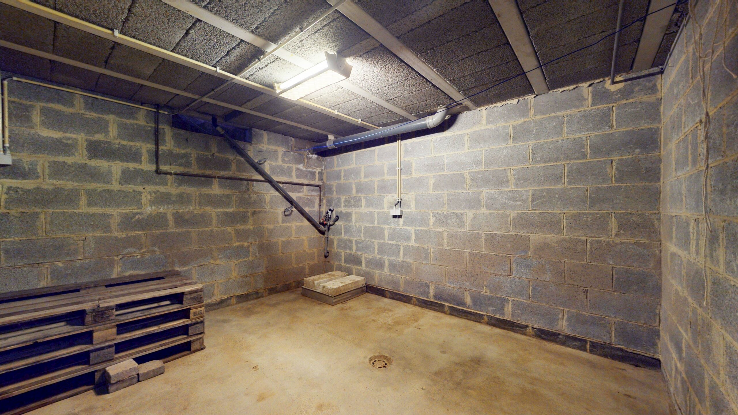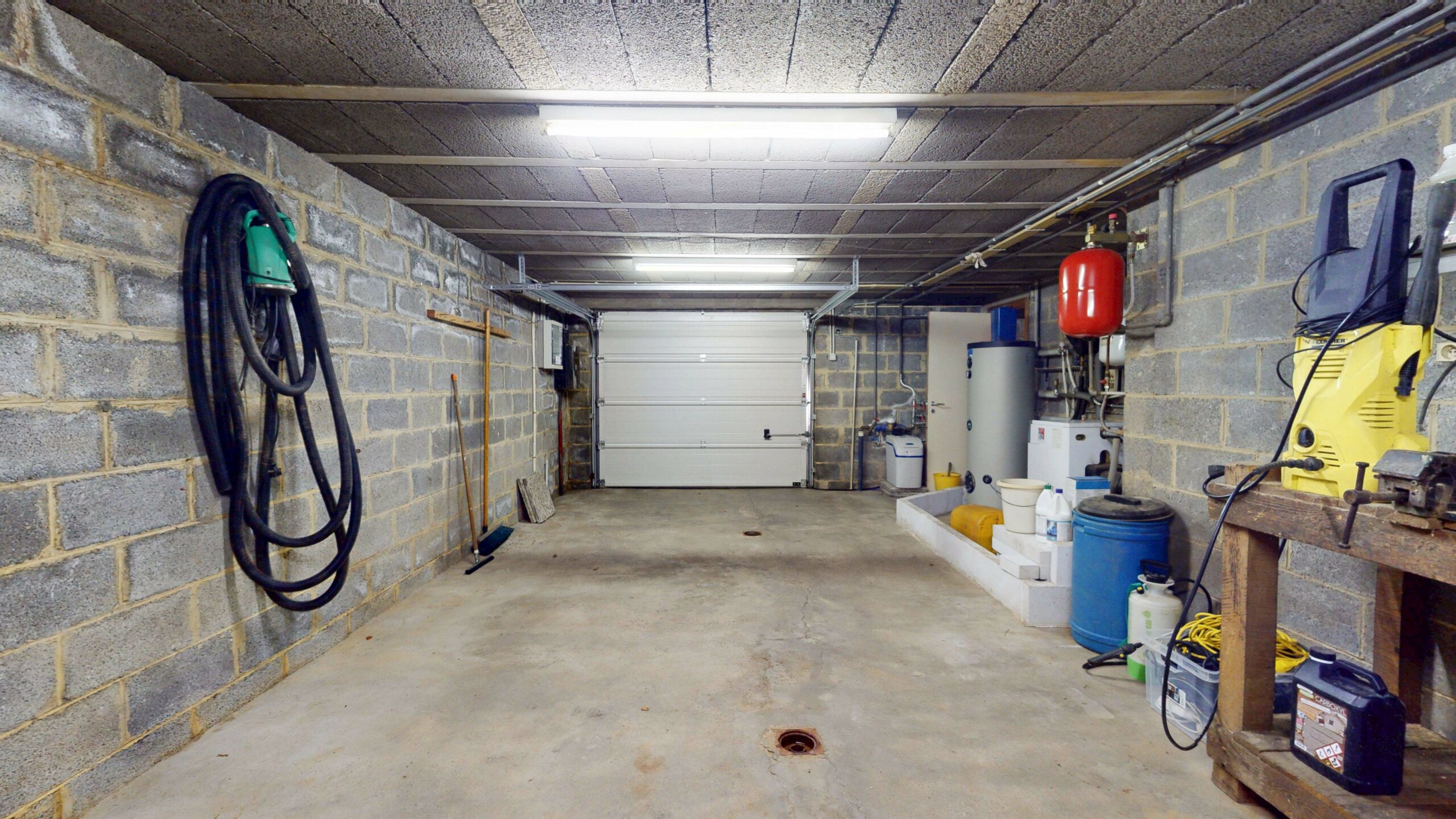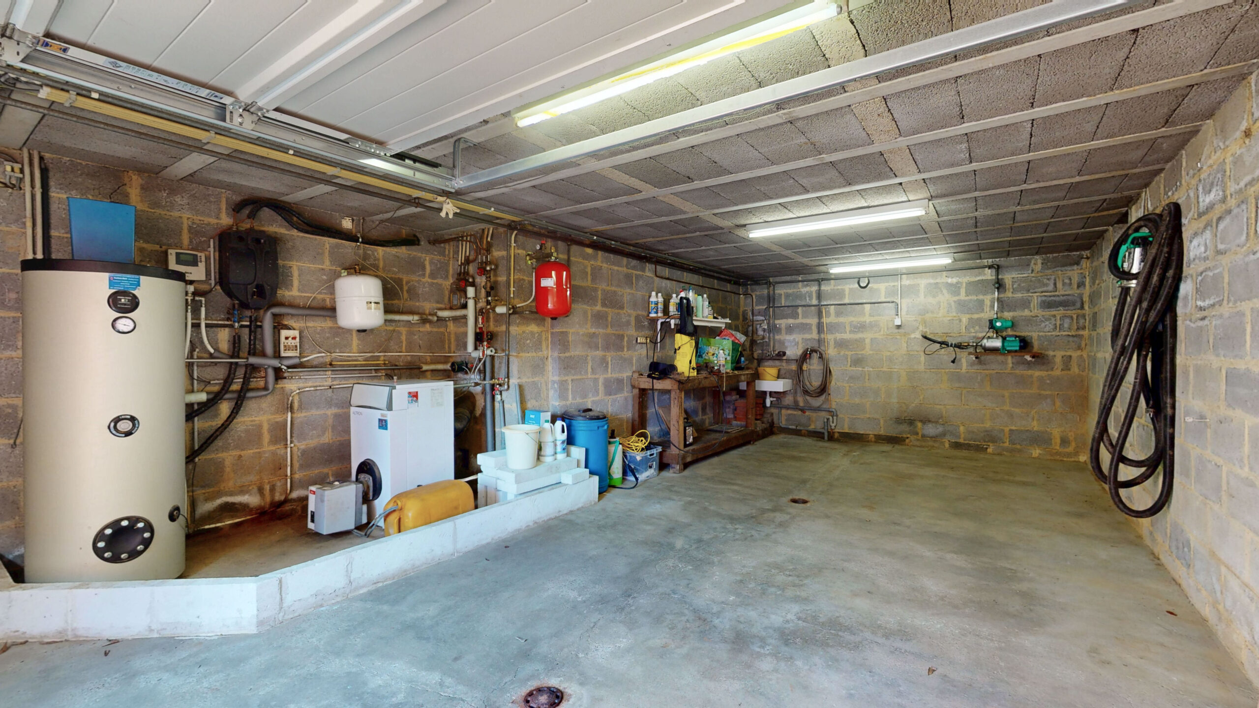 A la cave, nous avons le garage avec la chaufferie, la buanderie et une grande pièce cave.